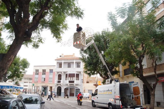 El Ayuntamiento de Totana ha empezado este viernes a colocar el alumbrado de las fiestas patronales de Santa Eulalia y navideño para dar ambiente y realzar las principales calles del centro histórico y zonas de mayor tránsito del casco urbano.