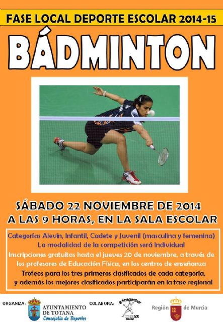 La Concejalía de Deportes del Ayuntamiento de Totana organiza mañana sábado 22 de noviembre, en colaboración con el Club Bádminton Totana, la Fase Local de Bádminton de Deporte Escolar, a partir de las nueve de la mañana, en la Sala Escolar.