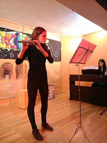 Todo ello culminó el viernes 21 de noviembre con el gran concierto que se celebró en el salón de actos del instituto, concierto del que se hicieron tres pases durante la misma mañana, para dar la posibilidad de asistir al mayor número posible de alumnos/as. Las actuaciones estuvieron protagonizadas por alumnos de todos los niveles de enseñanza, desde 1º de la ESO a 2º de bachillerato. La diversidad de estilos musicales fue enormemente variada. De esta manera, se pudo escuchar desde un rap, hasta música de rock duro, pasando por los evocadores sonidos del “Arabesque” nº 1 de C. Debussy. Tuvimos también la oportunidad de escuchar una preciosa canción interpretada por el grupo de alumnos de 1º A de la ESO, con letra y música creada por ellos mismos, como una iniciativa dentro de la clase de Lengua, de su profesora, Belén López. Alumnos de 3º de la ESO de la clase de Física y Química de la profesora Reyes Romero, sorprendieron a todos interpretando el himno de la alegría de Beethoven con copas y botellas. Con la intención de darle un carácter más pedagógico al concierto, además de incluir comentarios en cada una de las piezas interpretadas, se premió la atención del alumnado con el sorteo de un pequeño obsequio musical a aquellos alumnos/as que acertaran las preguntas de un sencillo cuestionario que se planteó al final de las audiciones.