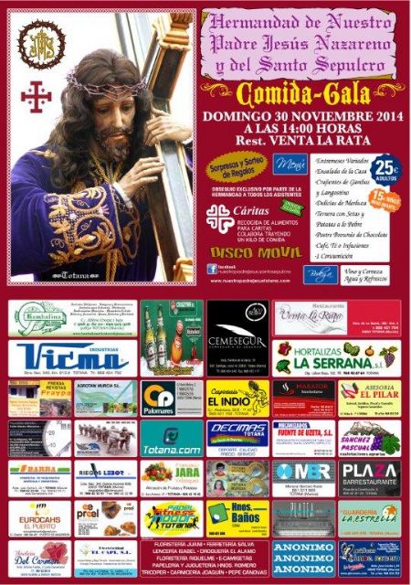 La Hermandad de Nuestro Padre Jesús Nazareno y Santo Sepulcro de Totana celebrará el domingo, día 30 de noviembre, a partir de las 14:00 horas, su comida anual de Hermandad, en el restaurante Venta la Rata.