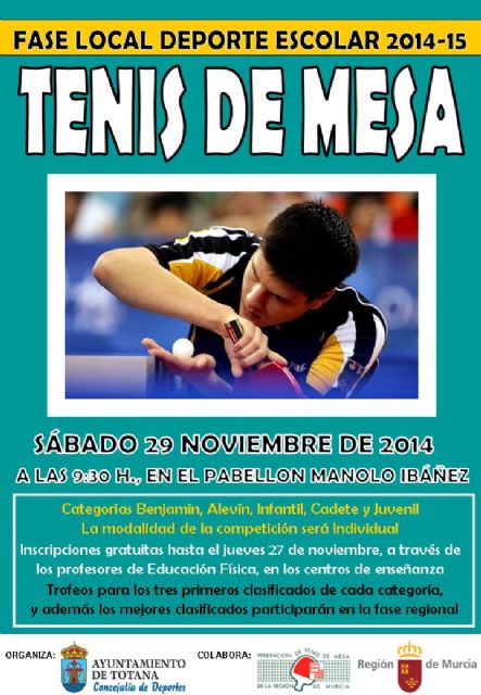 La Concejalía de Deportes organiza el próximo sábado 29 de noviembre, en colaboración con el Club Tenis de Mesa de Totana, la Fase Local de Tenis de Mesa de Deporte Escolar, a partir de las 9:30 horas, en el Pabellón Municipal de Deportes "Manolo Ibáñez".