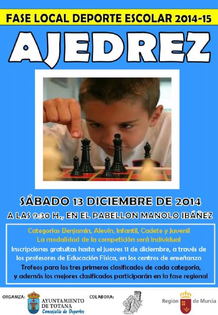 La Concejalía de Deportes del Ayuntamiento de Totana mañana sábado 13 de diciembre, en colaboración con el Club de Ajedrez Totana, la Fase Local de Ajedrez de Deporte Escolar, a partir de las nueve y media de la mañana, en el Pabellón Municipal de Deportes Manolo Ibáñez.