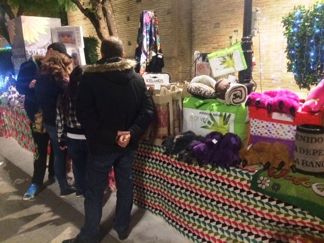 Comerciantes de Totana instalaron varios expositores en la plaza de la Constitución a modo de Mercado de Navidad durante toda la jornada dominical aprovechando las numerosas actividades organizadas en el centro de la ciudad con motivo del programa de Navidad y Reyes.