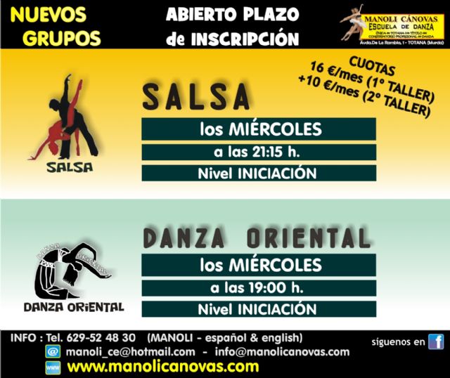 Además la Escuela de Danza Manoli Cánovas, va a lanzar un nuevo grupo de SALSA para los adultos que quieran empezar el año con diversión y sabrosura. Y para aquellas que quieran hacerlo con elegancia y sensualidad, podrán apuntarse al nuevo grupo de iniciación a la DANZA ORIENTAL. Las clases serán los Miércoles y para ambos está ya abierto el plazo de matrícula.