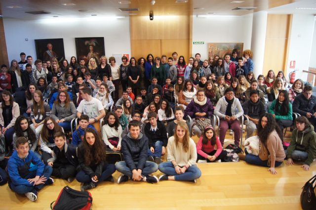 La alcaldesa de Totana, Isabel María Sánchez, y la concejal de Educaicón, presidieron hoy la recepción institucional que se realizó a los 54 alumnos del IES "Prado Mayor" y sus homónimos del instituto francés "Le Fontaine" de la localidad francesa de Bonillargues, en las proximidades de Nimes, que se celebró en el salón de plenos del Consistorio totanero.