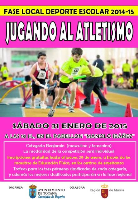 La Concejalía de Deportes del Ayuntamiento de Totana organiza mañana sábado 31 de enero la Fase Local de Jugando al Atletismo de Deporte Escolar, a partir de las diez de la mañana, en el Pabellón Municipal de Deportes Manolo Ibáñez.