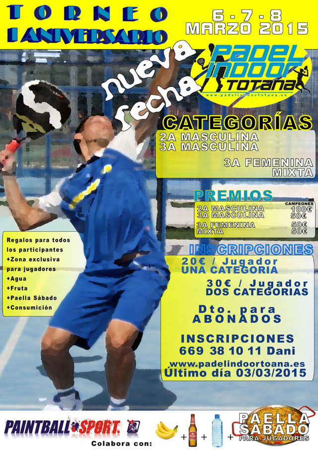 Totana Noticias Padel Indoor Totana organiza un Torneo con motivo de su I aniversario 10/02/2015 Padel Indoor Totana organiza un Torneo con motivo de su I aniversario Tendrá lugar el 6, 7 y 8 de marzo Fuente: Padel Indoor Totana
