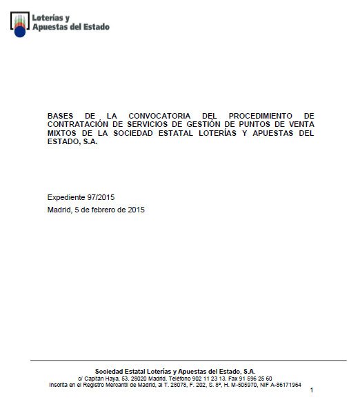 Las bases de la convocatoria se encuentran publicadas en la web de Loterías www.selae.es; o poniéndose en contacto con “Loterías y Apuestas del Estado C/ Fuensanta, 5 30001 Murcia Teléfonos 968/213 645 y 968 215 077 y Fax: 968 220 283 y e mail: delgacion@murcia.stilnter.net”