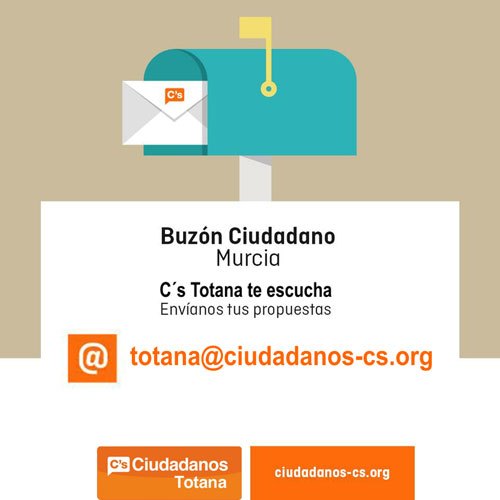 Desde la Directiva Local de CIUDADANOS en Totana quieren hacer participes directos a todos los totaneros del programa electoral que quieren presentar para las próximas elecciones municipales en nuestra localidad. Para ello, según informan desde la Directiva Local de Cs Totana, "tenemos nuestro BUZÓN CIUDADANO, a través de el podréis hacernos llegar vuestras propuestas directamente a esta Directiva para su estudio e inclusión en nuestro programa. También, caso de que lo veáis oportuno, nos podéis solicitar reunirnos para tratar el tema en cuestión. Al respecto, también comezaremos a iniciar los contactos oportunos con las Asociaciones mas representativas de este Municipio. Por supuesto, también podéis a través de nuestros foros sociales plantearnos abiertamente lo que queráis que se debata públicamente si es ese el caso".