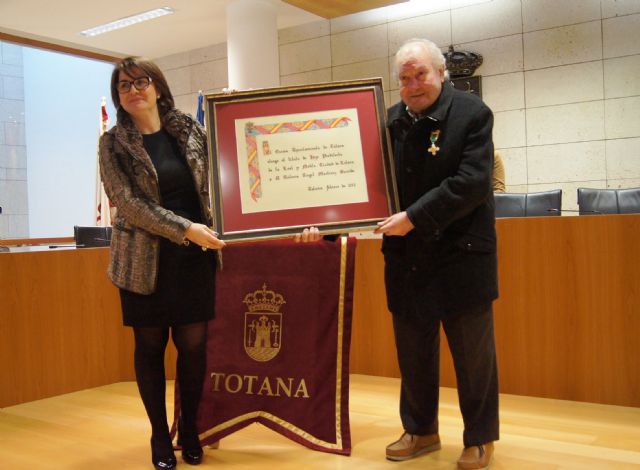 La alcaldesa, Isabel María Sánchez, en representación de la Corporación municipal, hizo entrega del pergamino al homenajeado, que agradeció al pueblo de Totana y a los presentes este reconocimiento institucional, que viene a dar cumplimiento al acuerdo de pleno, por unanimidad, que se promovió dando respuesta a una iniciativa ciudadana.