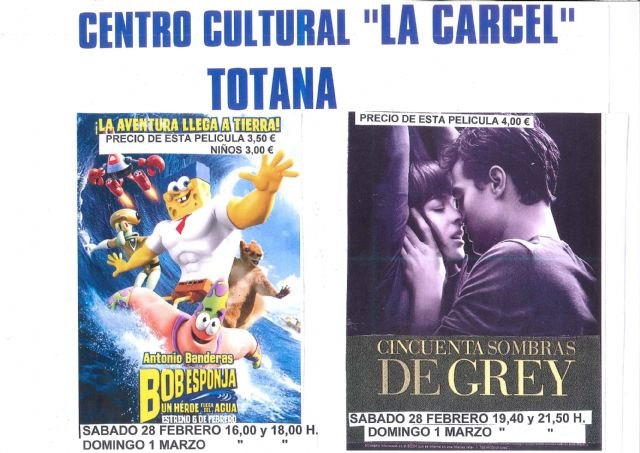 El Centro Sociocultural "La Cárcel" retoma la proyección de películas con los estrenos de "Bob Esponja" y "Cincuenta sombras de Grey", según informan fuentes de la Concejalía de Cultura Popular.