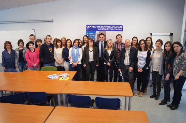 La alcaldesa de Totana, Isabel María Sánchez, junto con la concejal de Formación y Empleo, María José Baeza, y el director general del SEF, Alejandro Zamora, han dado la bienvenida a los alumnos del curso que inician hoy sus clases en el Centro de Desarrollo Local.