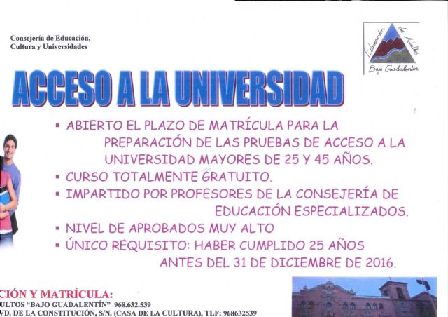 La Concejalía de Educación informa de que está abierto el plazo de inscripción para el curso de acceso a la Universidad para mayores de 25 y 45 años que se imparte en el Centro de Adultos Bajo Guadalentín, antiguo Instituto.