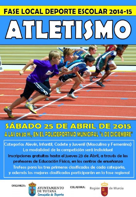 La Concejalía de Deportes del Ayuntamiento de Totana tiene previsto organizar el próximo sábado 25 de abril, a partir de las 9.30 horas de la mañana, en el Polideportivo Municipal "6 de diciembre", la Fase Local de Atletismo de Deporte Escolar, en la que participarán alumnos de todos los centros de enseñanza de la localidad, pertenecientes a las categorías alevín, infantil, cadete y juvenil, tanto en modalidad masculina como femenina.