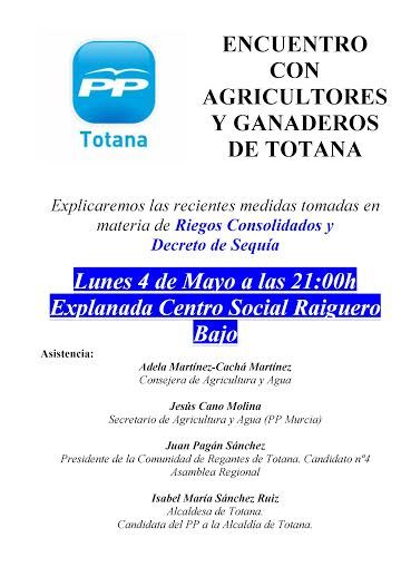 En el acto participarán la Consejera de Agricultura y Agua, Adela Martínez-Cachá, los Candidatos a la Asamblea Regional, Jesús Cano y Juan Pagán, y la Candidata a la Alcaldía de Totana, Isabel María Sánchez Ruiz.