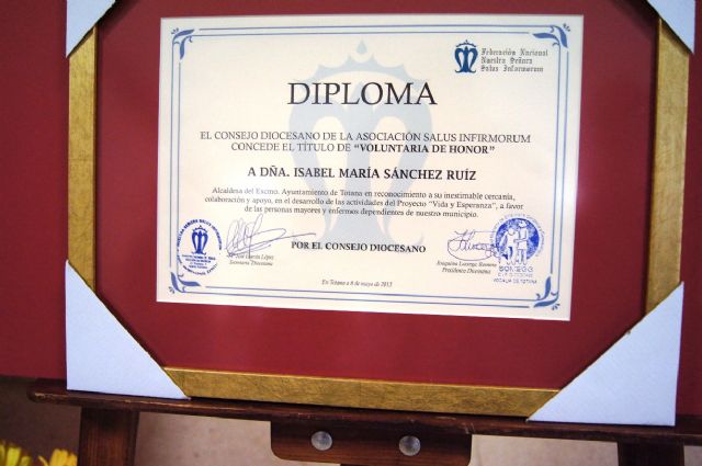 La asociación "Salus Infirmorum" ha nombrado "Voluntaria de Honor" de esta organización a la alcaldesa de Totana, Isabel María Sánchez, por su contribución durante estos años al voluntariado en el marco del programa "Vida y Esperanza", según explicó su presidenta, Joaquina Lucerga.