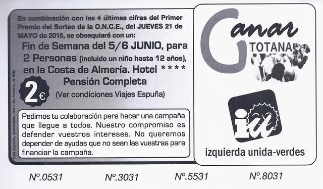 Como en las campaña electorales anteriores, GANAR TOTANA Izquierda Unida, ha iniciado una campaña para solicitar aportaciones de los vecinos y vecinas, con el fin de financiar su campaña electoral para las municipales que se celebran el 24 de mayo. En este caso, la Formación de Izquierdas, ha emitido unos bonos de 2 y 5 euros para que quien lo desee los compre y pueda ayudar a financiar la campaña electoral.
