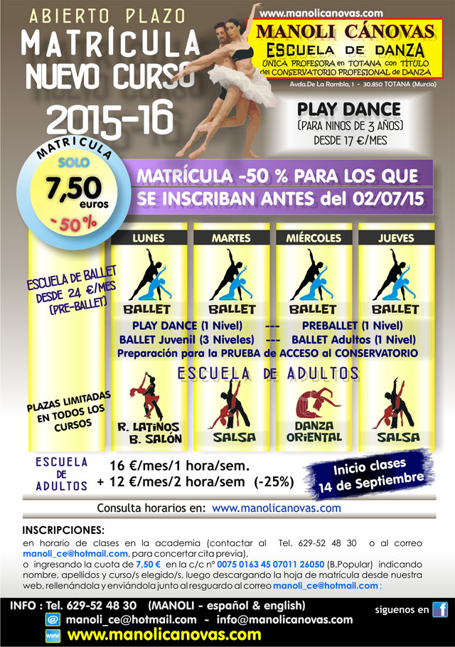 Todos aquellos que se inscriban antes del 02 de Julio, además de asegurarse la plaza para los estilos deseados (todos los cursos tienen plazas limitadas) se beneficiarán del 50 % de descuento en la cuota de matrícula. Para más información, horarios y tarifas consultar en www.manolicanovas.com .