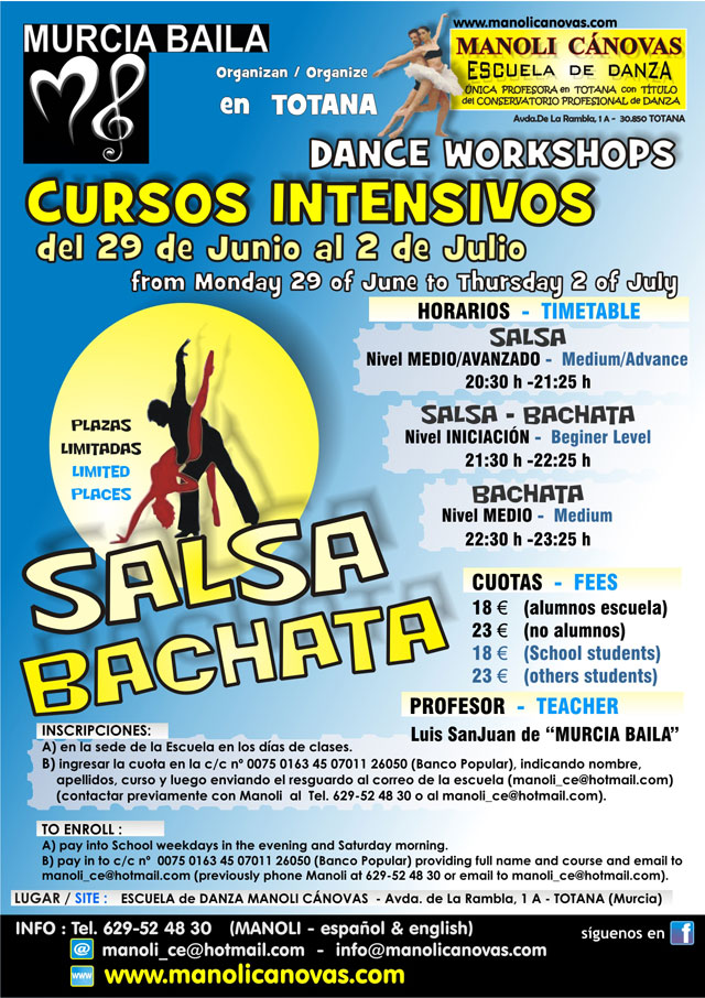 Los talleres se impartirán en las instalaciones de la escuela en Totana y se desarrollarán por la noche, deL Lunes 29 de Junio aL Jueves 2 de Julio. Habrá distintos niveles para todos los gustos, desde aspirante a salsero/bachatero hasta salsero consolidado pasando por un nivel intermedio de Bachata. El único requisito será el de siempre, tener ganas de pasarlo bien disfrutando del ritmo.