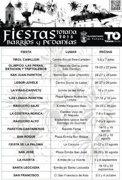 La Concejalía de Festejos continúa su colaboración y planificación junto con asociaciones de vecinos y colectivos para la organización de las fiestas en barrios y pedanías para este verano del 2015, en el que se celebrarán un total de 16 festejos que se prolongarán hasta principios de octubre.