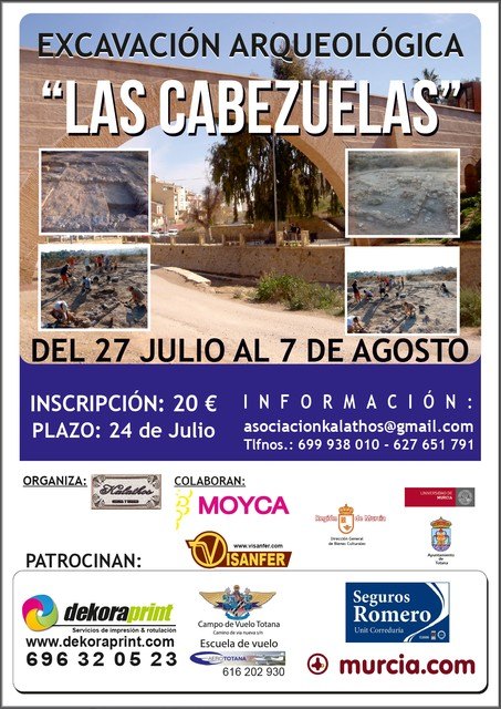 La Asociación Kalathos, en su empeño por la difusión del patrimonio de Totana, organiza esta actividad, que está dirigida por los arqueólogos Verónica Carricondo, José A. González Guerao y Juan A. Ramírez Águila. Así mismo, cuentan con la colaboración del Ayuntamiento de Totana, el Servicio de Patrimonio Histórico de la Región de Murcia y el profesor de Historia Antigua de la Universidad de Murcia, Rafael González. En esta línea agradecer a las empresas que colaboran y patrocinan con este ambicioso proyecto de investigación.
