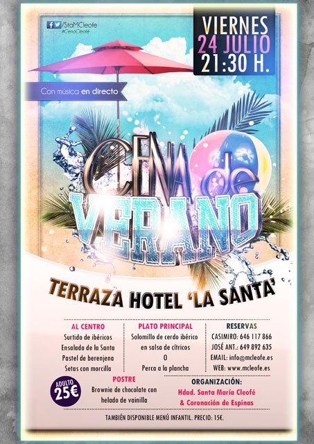 La Hermandad de Santa María Cleofé y Coronación de Espinas organiza el próximo viernes, 24 de julio de 2015 a las 21:30 horas su tradicional Cena de Verano en la Terraza del Hotel Monasterio de “La Santa”.