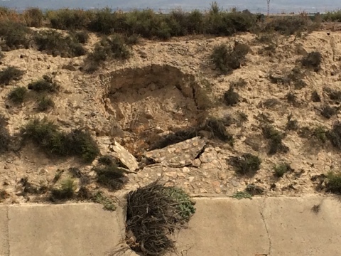 El peligro lo produce un amplio corrimiento de tierras que cada día es mayor en el canal que ha producido una abertura importante en el terreno, ayudado también por los nidos de conejos que proliferan en la zona.