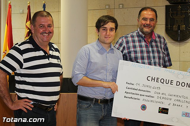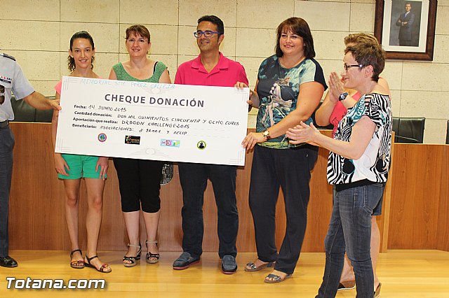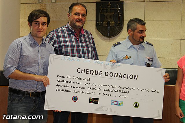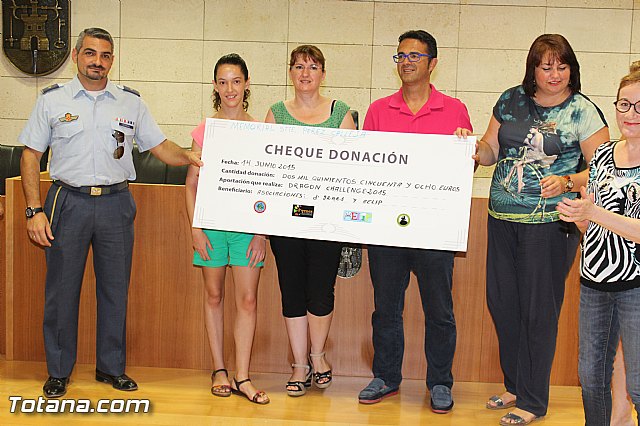 El alcalde de Totana, Juan José Cánovas, ha presidido el acto de entrega que ha realizado el comandante jefe del Escuadrón de Vigilancia Aérea EVA-13, Ricardo Acebal, de la recaudación de la Carrera Dragon Challenge “Memorial Subteniente Juan Carlos Pérez Calleja” a la Asociación de Enfermedades Raras D´Genes y la Asociación de Familiares y Afectados de Lipodistrofias (AELIP).