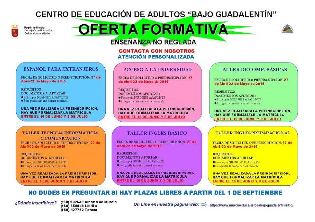 La Concejalía de Educación informa de que ya se conoce la oferta formativa del Centro de Educación de Adultos "Bajo Guadalentín" para el curso 2015/2016, que se ofrece en el antiguo IES "Juan de la Cierva" y a la que los interesados ya se pueden apuntar en la avenida de Lorca, número 62 o a través del teléfono 968/427752.