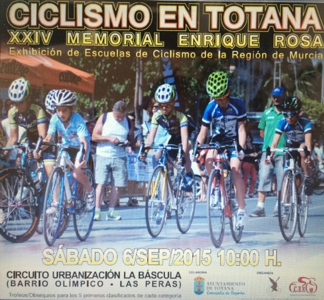 El XXIV Memorial "Enrique Rosa" de Ciclismo se celebrará el próximo día 6 de septiembre, organizado por el Club Ciclista de Totana y con la colaboración de la Concejalía de Deportes, este año la prueba ha cambiado su tradicional recorrido y se llevará a cabo por el barrio del Olímpico-Las Peras, en la urbanización "La Báscula" a partir de las 10:00 horas, y no por la de "El Parral" como en anteriores ediciones.