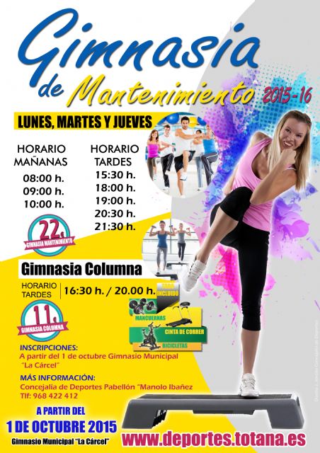 La Concejalía de Deportes tiene previsto comenzar el jueves, día 1 de octubre, el programa municipal de "Gimnasia de Mantenimiento 2015/2016" en las instalaciones municipales del Gimnasio "La Cárcel".