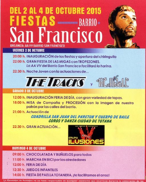 Las fiestas del barrio de San Francisco se celebran este próximo fin de semana, del 2 al 4 de octubre, y con éstas finaliza oficialmente el calendario de festejos en barrios y pedanías del verano en el 2015, según informan fuentes de la Concejalía de Festejos.