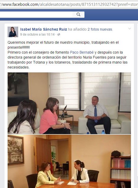 El alcalde de Totana, Juan José Cánovas, ha lamentado el gesto de "deslealtad institucional" del consejero de Fomento e Infraestructuras, Francisco Bernabé, quien se ha reunido hace unos días en la sede de la Consejería con la portavoz del PP y ex alcaldesa, Isabel María Sánchez; antes de hacerlo con él, como máxima autoridad municipal, según informaron fuentes municipales en un comunicado.
