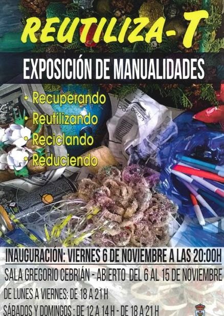 La exposición de manualidades "Reutiliza-T" sobre elementos reutilizados y reciclados se celebrará del 6 al 15 de noviembre en la sala municipal "Gregorio Cebrián", en la que los visitantes podrán conocer las posibilidades de recuperación y reciclaje para construir nuevos elementos.