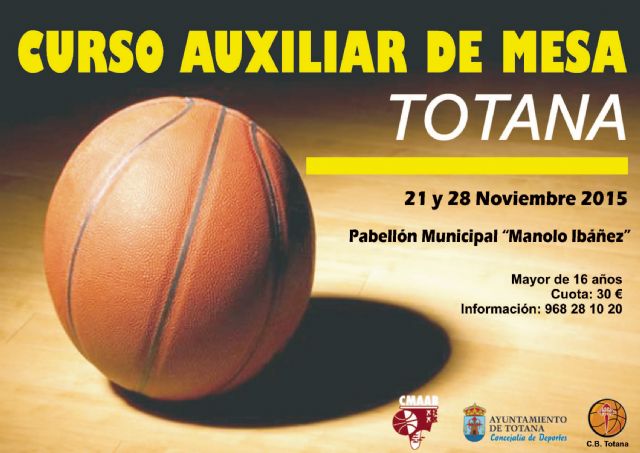 La Concejalía de Deportes informa de que el próximo sábado, día 21 de noviembre, arranca el "Curso de Auxiliar de Mesa de Baloncesto", organizado conjuntamente por el Comité de Árbitros de Baloncesto de la Región de Murcia, la propia Concejalía y el C.B. Totana.