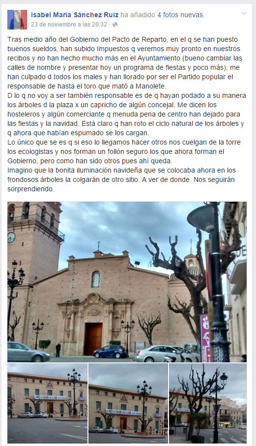1 - Mediante escrito presentado en este ayuntamiento el pasado 6 de noviembre con número de registro de entrada 10896, todos, absolutamente todos los comercios de esta plaza, tanto de ropa, como de telefonía, de hostelería y restauración, farmacia, asociación de taxistas y la propia parroquia de Santiago, solicitaron la poda del mencionado arbolado por la suciedad y molestias que, llegado el otoño/invierno, ocasionan en sus negocios y actividades. Por este motivo, es imposible que la señora Concejala del PP haya hablado con los comerciantes de la zona, de lo contrario se hubiera enterado de sus peticiones a esta Concejalía.