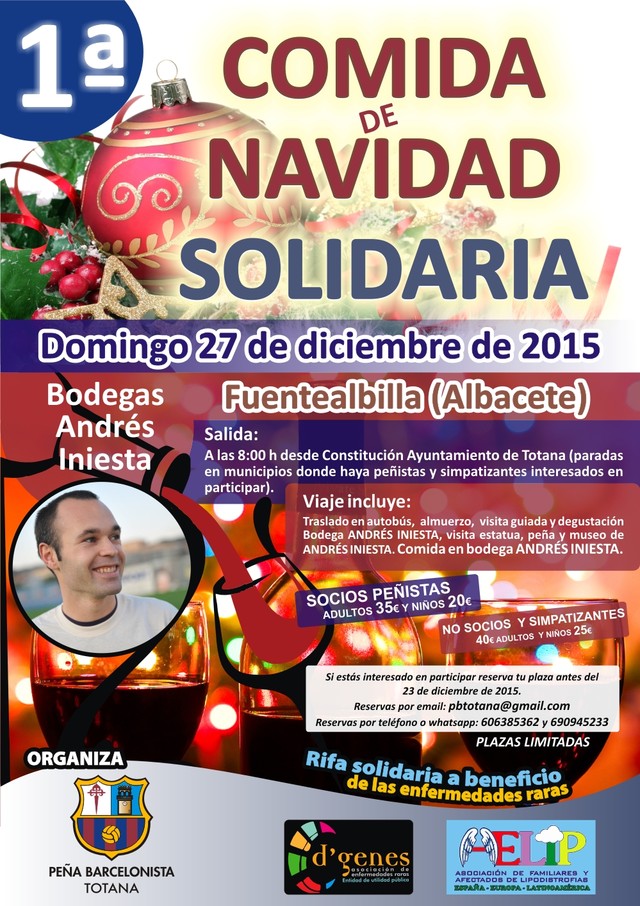 La Peña Barcelonista de Totana, en colaboración con las asociaciones D’Genes y AELIP, organiza la I Comida de Navidad Solidaria, que tendrá lugar el próximo domingo 27 de diciembre, en Fuentealvilla (Albacete), en las Bodegas Andrés Iniesta.