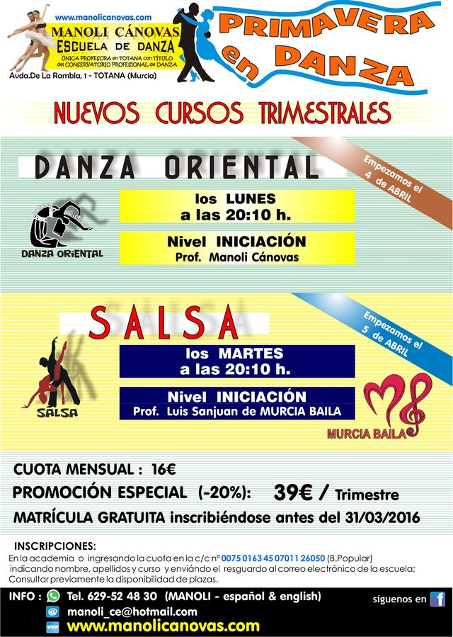 De cara a la llegada de la primavera, la citada escuela pondrá en marcha un año más otros cursos permanentes incluidos en la campaña Primavera en Danza. Este año serán de Danza del vientre y Salsa, también con tarifas especiales de 16€ al mes o 39€ el trimestre.