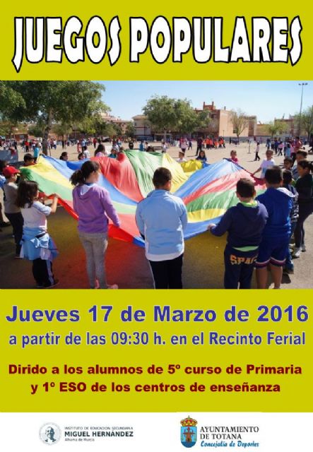 La Concejalía de Deportes tiene previsto organizar mañana jueves, 17 de marzo, una Jornada de Juegos Populares en el Recinto Ferial, a partir de las 09:30 horas de la mañana, en colaboración con el TAFAD del IES "Miguel Hernández" de Alhama y todos los centros de enseñanza de la localidad.