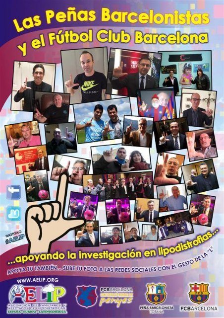 El presidente de la PB Totana y de la Federación de Peñas Barcelonistas de la región de Murcia, Juan Carrión, ha contactado con el FC Barcelona para que directivos del club, jugadores en activo y exjugadores apoyen la investigación en lipodistrofias fotografiándose con la “L” que representa el apoyo a la investigación de esta rara enfermedad. Así, y tal como se muestra en las fotos adjuntas, se han querido sumar a esta iniciativa que se pone en marcha desde Totana (donde está la sede de la asociación internacional pionera en el apoyo a este tipo de investigación, AELIP, y donde ha partido la iniciativa de simbolizar, por segundo año consecutivo, este apoyo con una L realizada con el índice y el pulgar de la mano derecha), entre otros, el presidente del FCB Josep M. Bartomeu y el vicepresidente 1º Jordi Cardoner, los jugadores Andrés Iniesta y Luis Suarez, exjugadores como Robert Fernández (actual secretario técnico del FCB), Lobo Carrasco, Sergi Barjuan, Pichi Alonso y Julio Salinas, el seleccionador nacional Vicente Del Bosque, y un sinfín de personalidades relacionadas con el presente y pasado del FC Barcelona.