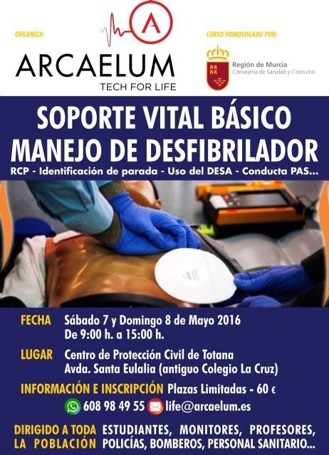 La Concejalía de Desarrollo Económico informa de que los próximos 7 y 8 de mayo, el Centro de Protección Civil de Totana, acogerá el curso de Soporte Vital Básico (SVB) con manejo y uso de desfibriladores semiautomáticos externos (DESA). Dicho curso se impartirá en horario de mañana de 9:00 a 15:00 horas y tiene plazas limitadas.