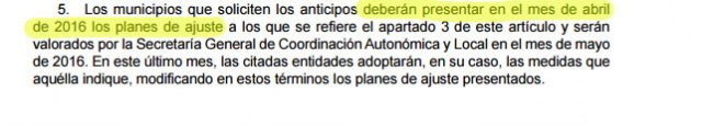 ¿Cual era la contrapartida que ponía el Ministerio y se aceptó por el Pleno sin rechistar? La presentación de un Plan de Ajuste antes del 29 de abril de 2016. ¿Cómo es posible que quien tiene la responsabilidad de realizar ese Plan de Ajuste, delegada por el Alcalde, no lo haya hecho desde octubre hasta el 27 de abril? Alguien debería responder a eso.