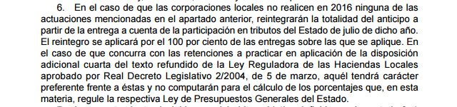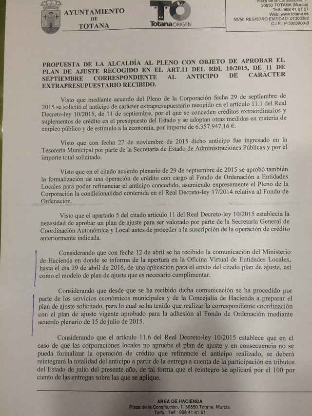 "El 29 de septiembre de 2015, el Pleno del Ayuntamiento de Totana solicita al Ministerio de Hacienda un anticipo de la Participación en los Tributos el Estado por 6.357.947,16 euros. según el Decreto Ley 10/2015.