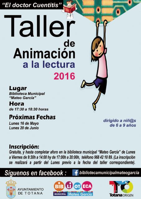 Los niños y niñas interesados, pueden inscribirse en la Biblioteca Municipal "Mateo García", a partir del 9 de mayo, de lunes a viernes de 9:30 a 14:00 o de 17:00 a 20:00 horas, mas información en el teléfono 968 42 10 89 o en el correo electrónico bilioteca@totana.es.