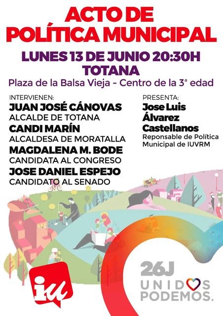 Intervendrán los cabeza de lista de Unidos Podemos al Senado, José Daniel Espejo, y la candidata número 3 al Congreso, Magdalena Martínez Bode. También los alcaldes de Totana y Moratalla, Juan José Cánovas y Candi Marín.