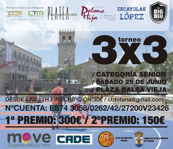 El II Torneo 3x3 de Baloncesto, en categoría senior, se disputará el sábado, día 25 de junio, en la plaza de la Balsa Vieja, organizado por el Club de Baloncesto Totana y con la colaboración de la Concejalía de Deportes del Ayuntamiento de esta localidad.
