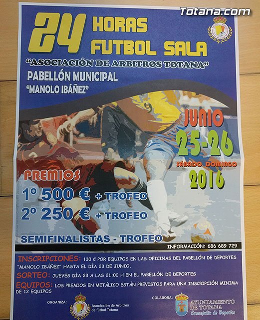 Las 14 horas de Fútbol-Sala se celebrarán los próximos días 25 y 26 de junio en el Pabellón de Deportes "Manolo Ibáñez" de Totana, organizadas por la Asociación de Árbitros de esta localidad y con la colaboración de la Concejalía de Deportes.