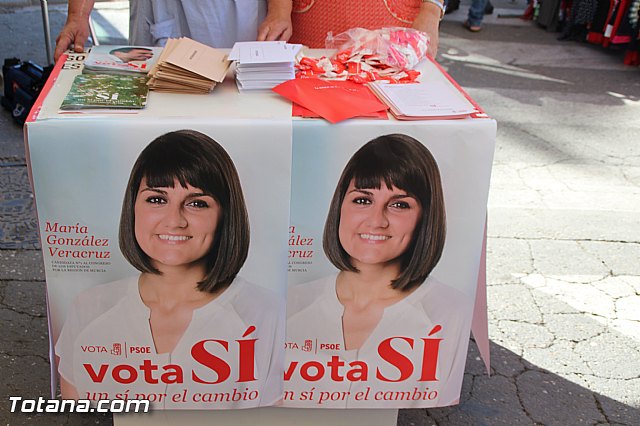 Totana, recibía esta mañana, la visita de María González Veracruz, que encabeza la candidatura al Congreso de los Diputados por la Región de Murcia que, junto a Isabel Casalduero y Alfonso Martínez Baños, diputados en la Asamblea Regional y acompañados por otros miembros del PSOE de Totana, han recorrido el mercadillo semanal para dar a conocer, a los vecinos y vecinas, las propuestas del programa electoral socialista.
