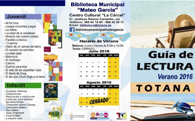 La guía se podrá recoger a partir de hoy en la biblioteca municipal "Mateo García", de lunes a viernes de 8:30 a 14:00 horas, y en el Centro Sociocultural "La Cárcel", teléfono de información 968 421 089, email biblioteca@totana.es.