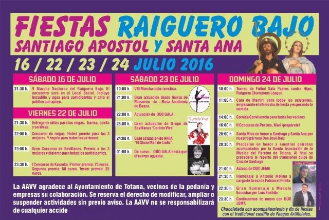 Las fiestas de El Raiguero Bajo se celebrarán del 22 al 24 de julio en honor a Santiago Apóstol y Santa Ana, si bien este próximo sábado, 16 de julio comienza el programa de forma oficial con la V Marcha Nocturna de esta diputación, en el que se repartirán bocadillos para los participantes y público asistente, a partir de las 21:30 horas.